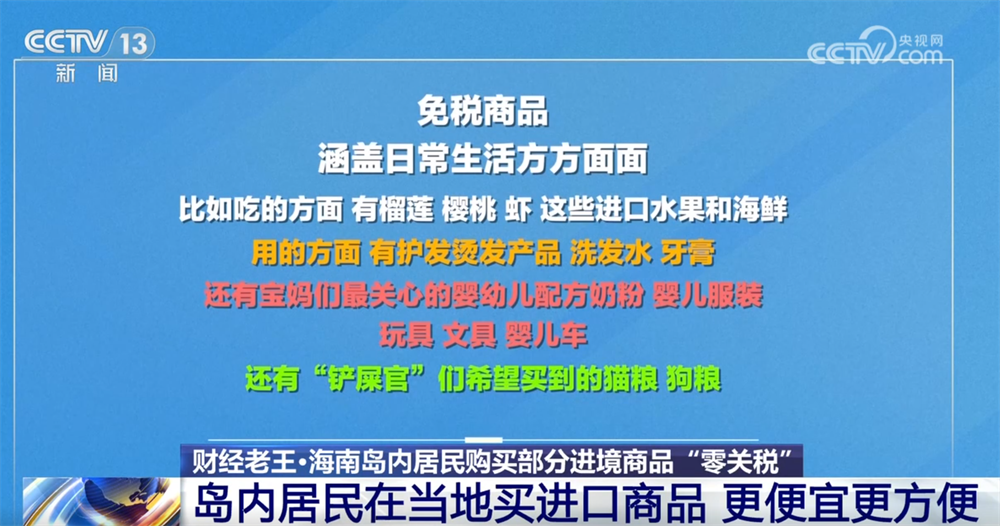 再来看看能买什么?政策实行正面清单管理,免税商品目录有202种!涵盖了咱们日常生活的方方面面,比如吃的方面,有榴莲、樱桃、虾这些进口水果和海鲜;用的方面,有护发烫发产品、洗发水、牙膏;还有宝妈们最关心的婴幼儿配方奶粉、婴儿服装、玩具、文具、婴儿车,还有“铲屎官”们希望买到的猫粮、狗粮。而且这份清单会根据海南的实际情况适时调整。